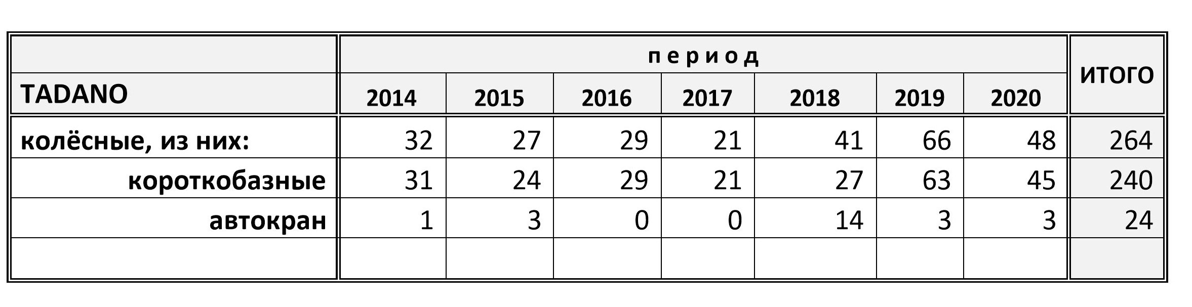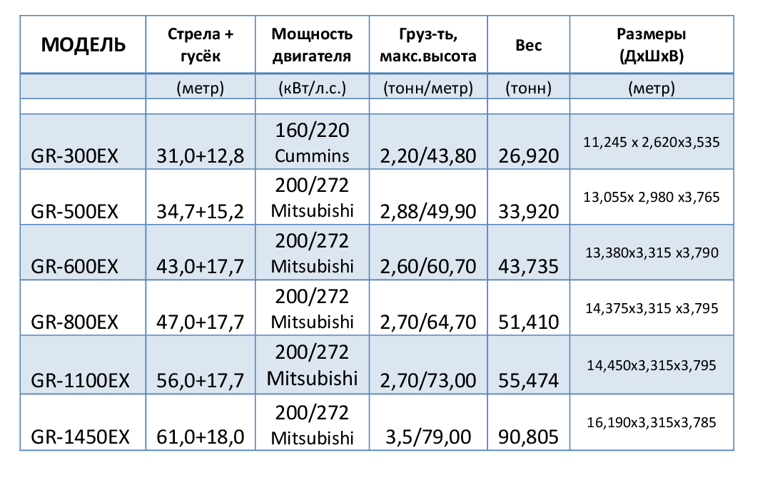 В настоящий момент на российском рынке представлены краны: GR-300EX-4, GR-500EX-4, GR-600EX-4, GR-800EX-4, GR-1100EX-4 и GR-1450EX-4. Прямыми поставками из Японии на наш склад в Находке мы обеспечиваем наличие техники для клиентов. Краны TADANO полностью адаптированы и сертифицированы для использования на Российском рынке. Соотношение технических параметров и характеристик (Таблица 1) позволяет удовлетворить самые взыскательные требования наших партнеров.