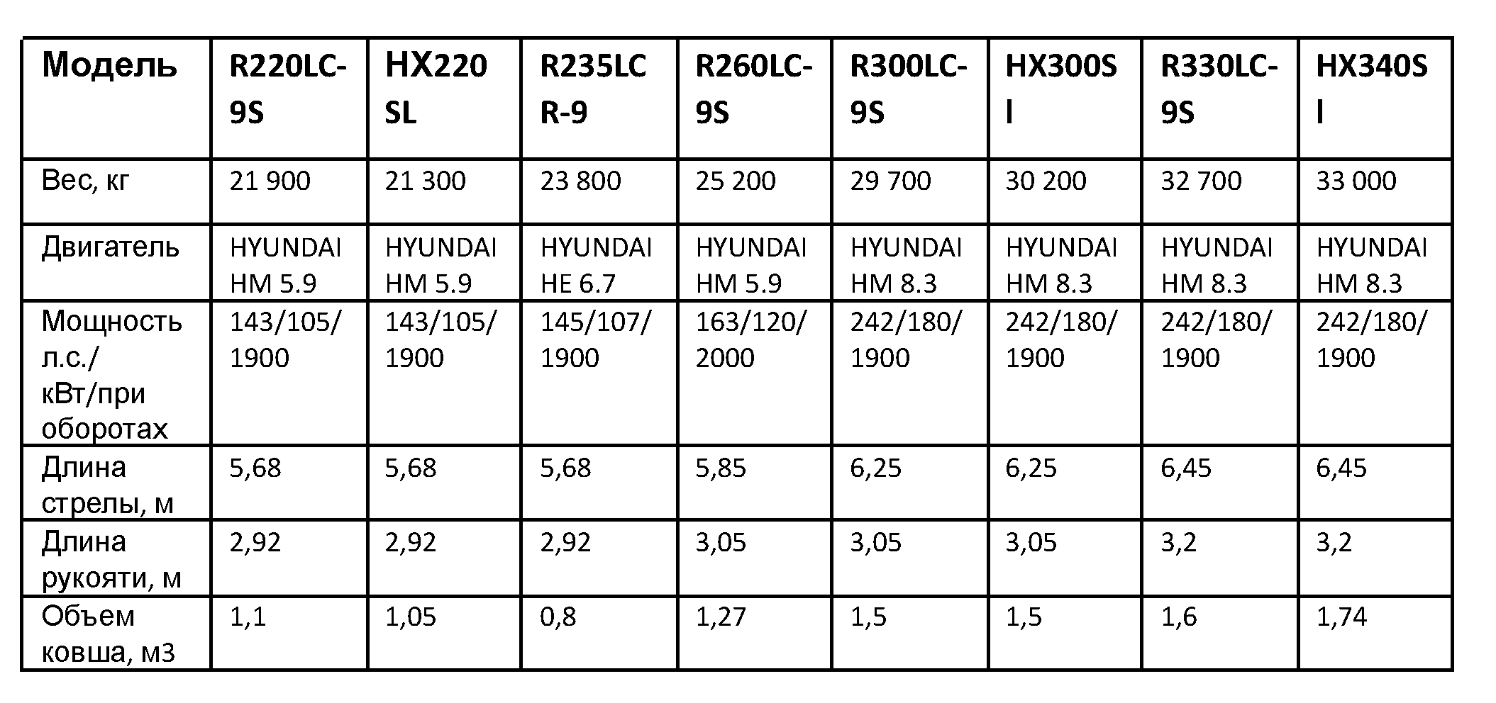 Компания Hyundai выпускает 25 моделей гусеничных экскаваторов от 1,5 до 120 тонн с ковшами от 0,04 м3 до 6,7 м3.