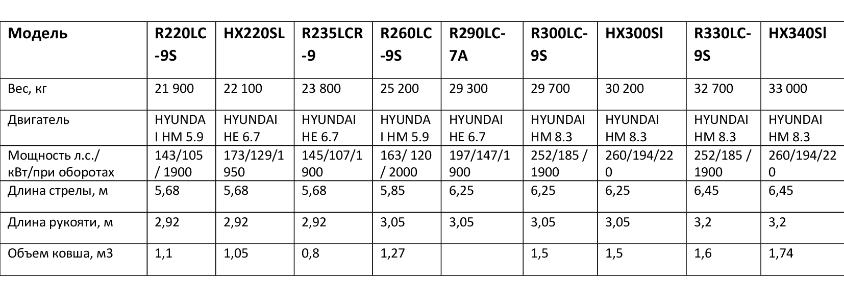 Компания Hyundai выпускает 25 моделей гусеничных экскаваторов от 1,5 до 120 тонн с ковшами от 0,04 м3 до 6,7 м3.