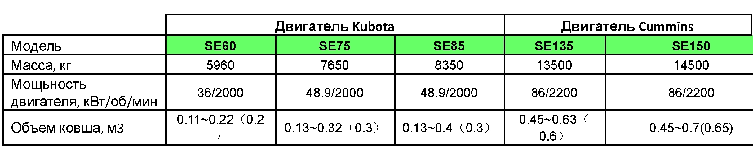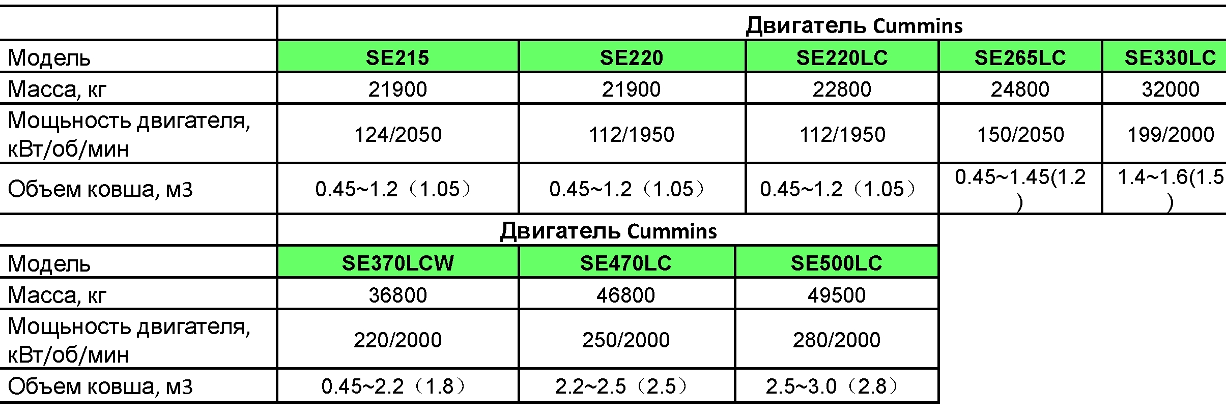 Линейка экскаваторов производства Shantui Construction Machinery Co., Ltd. включает в себя 13 моделей массой от 6т до 50т с объемами ковша от 0,22м3 до 3м3. Устанавливаемые двигатели известных мировых производителей: Kubota, Cummins, Weichai обладают оптимальными мощностными характеристиками, высокой прочностью и долговечностью, комплектуется трехступенчатой системой фильтрации топлива.