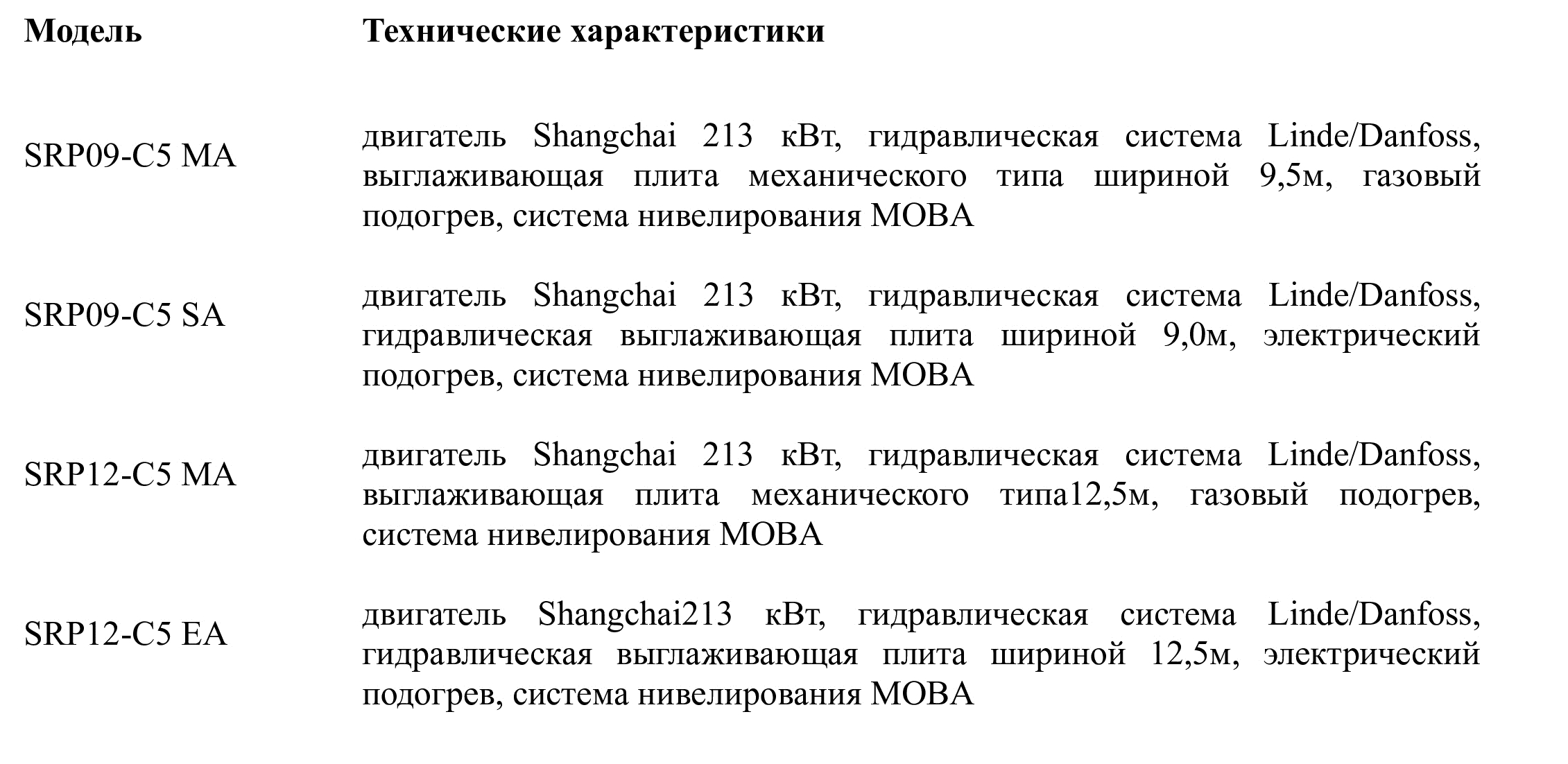 Многофункциональный асфальтоукладчик серии SRP в основном используется для укладки асфальтобетонного покрытия, а также подстилающих слоев из стабилизирующих материалов для дорог различного класса. Асфальтоукладчики комплектуются различными выглаживающими плитами: жесткими или с гидравлическим изменением ширины, с вибрацией и трамбующим брусом, с электрическим или газовым подогревом. Машина спроектирована с учетом самых передовых технологии, в том числе: компьютерное управление гидравлической системой, автоматическое выравнивание с помощью системы нивелирования, само диагностика неисправностей. Укладчик отличается высокой мощностью, хорошей стабильностью укладки, равномерной подачей материала, высокой плотностью предварительного уплотнения и простотой управления. Гидравлическая телескопическая выглаживающая плита, ширина укладки которой регулируется в пределах 3,0–5,7 м для адаптации к различным рабочим условиям, имеет большую жесткость на изгиб и кручение, обеспечивает оптимальную ровность укладываемого материала.