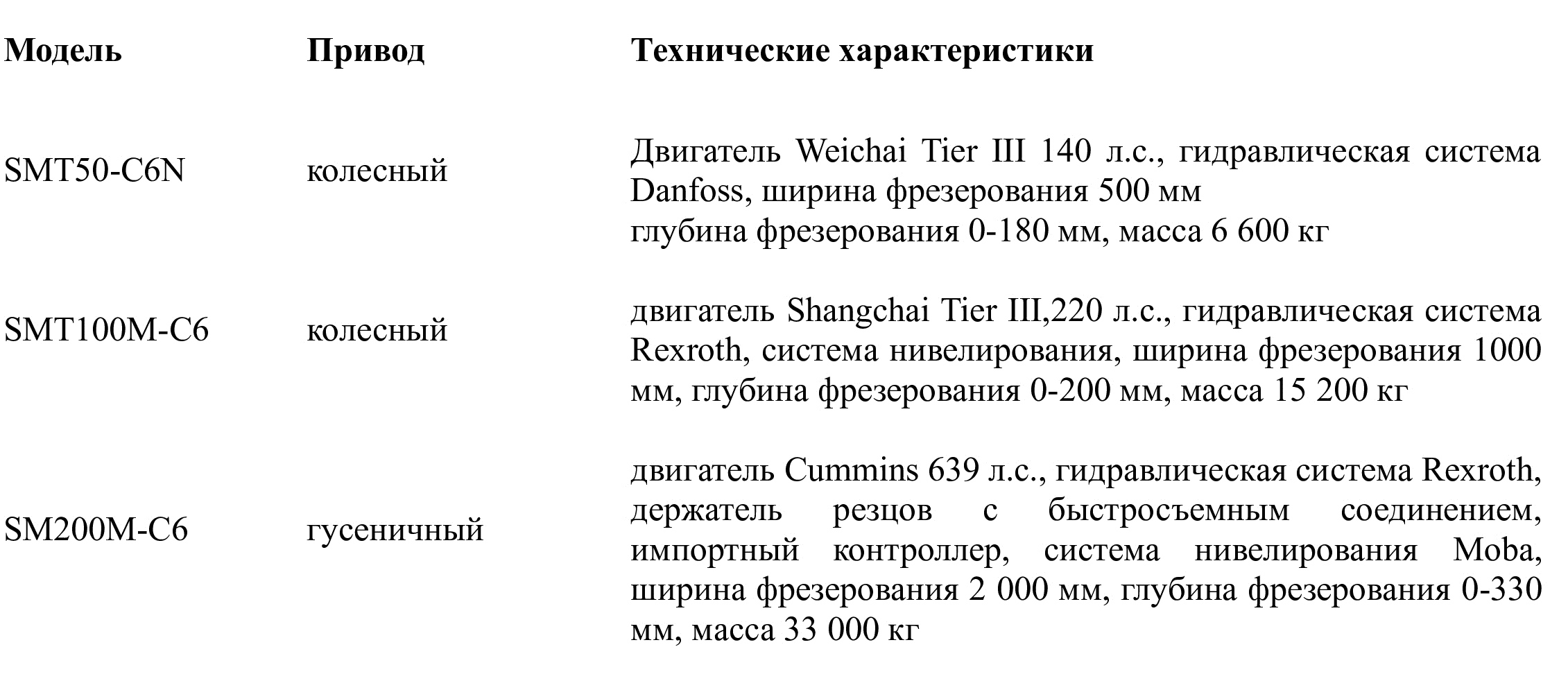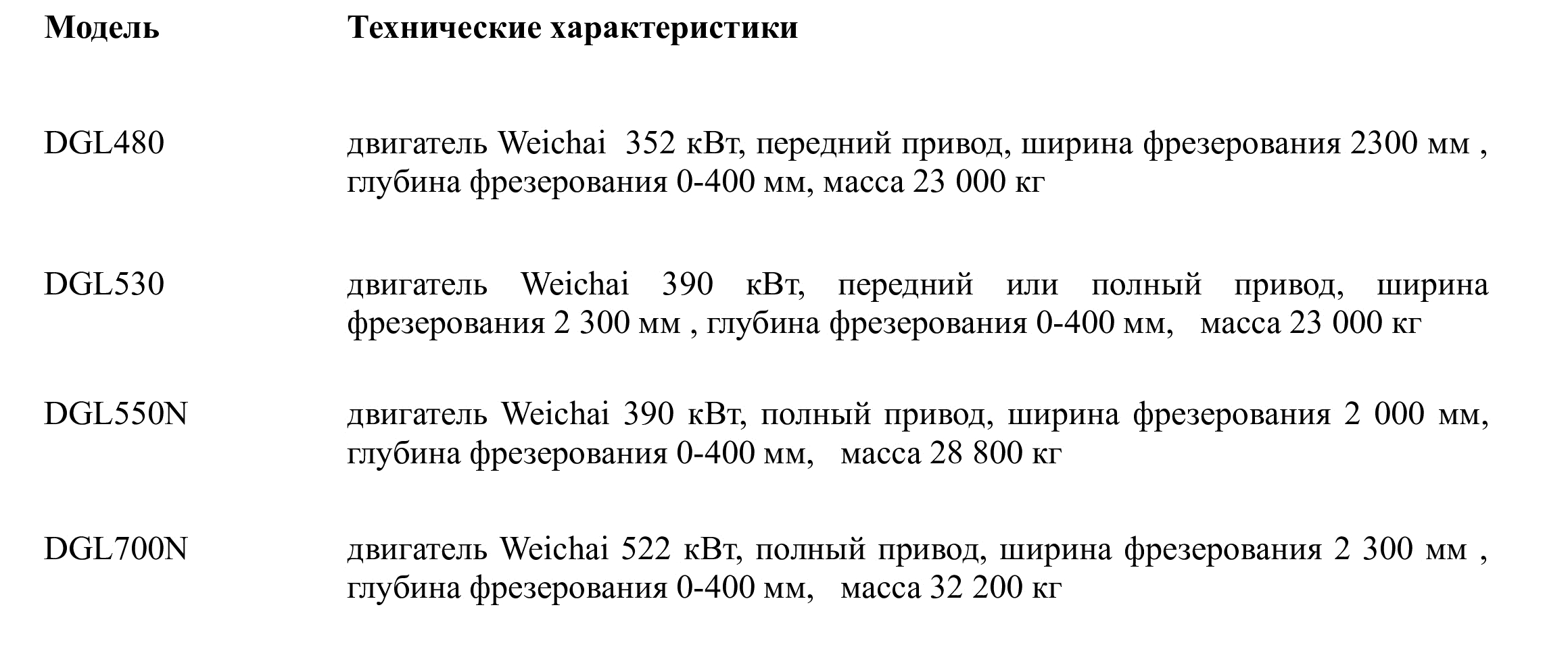 4 модели мощностью от 360 кВт до 522 кВт имеют ширину фрезерования 2 и 2.3 м, глубиной до 40 см с передним или полным приводом.
