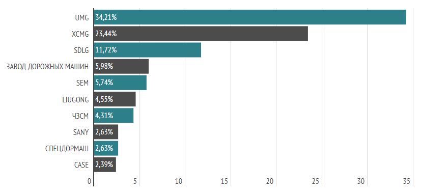 Как мы уже говорили выше, большую долю (около 30%) занимают китайские автогрейдеры SDLG, SEM, XCMG, LiuGong, однако в России представлены и другие игроки: Volvo, CAT, Komatsu.