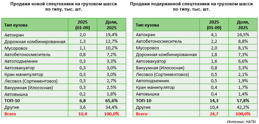 По данным Национального агентства промышленной информации (НАПИ), за три квартала 2025 года в стране было реализовано 10 400 единиц новой и 24 700 подержанной спецавтотехники на грузовых шасси.