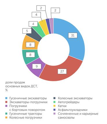 К основным видам ДСТ в России, по данным Ассоциации европейского бизнеса, относятся гусеничные экскаваторы (31% рынка), экскаваторы-погрузчики (27%), погрузчики с бортовым поворотом (9%), гусеничные тракторы (8%), колесные погрузчики (8%), колесные экскаваторы (5%), автогрейдеры (5%), катки (4%), асфальтоукладчики (2%), сочлененные и карьерные самосвалы.